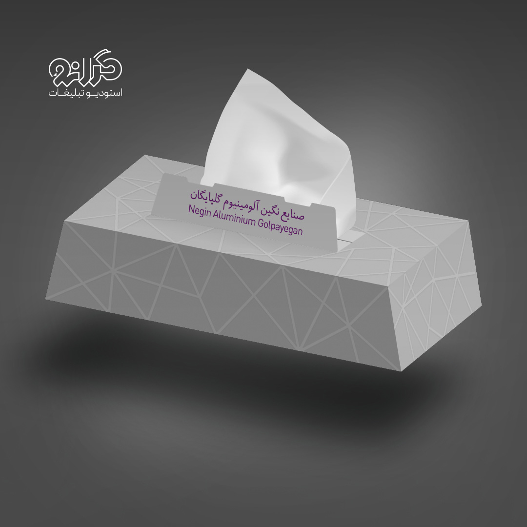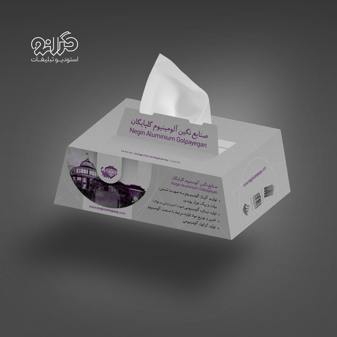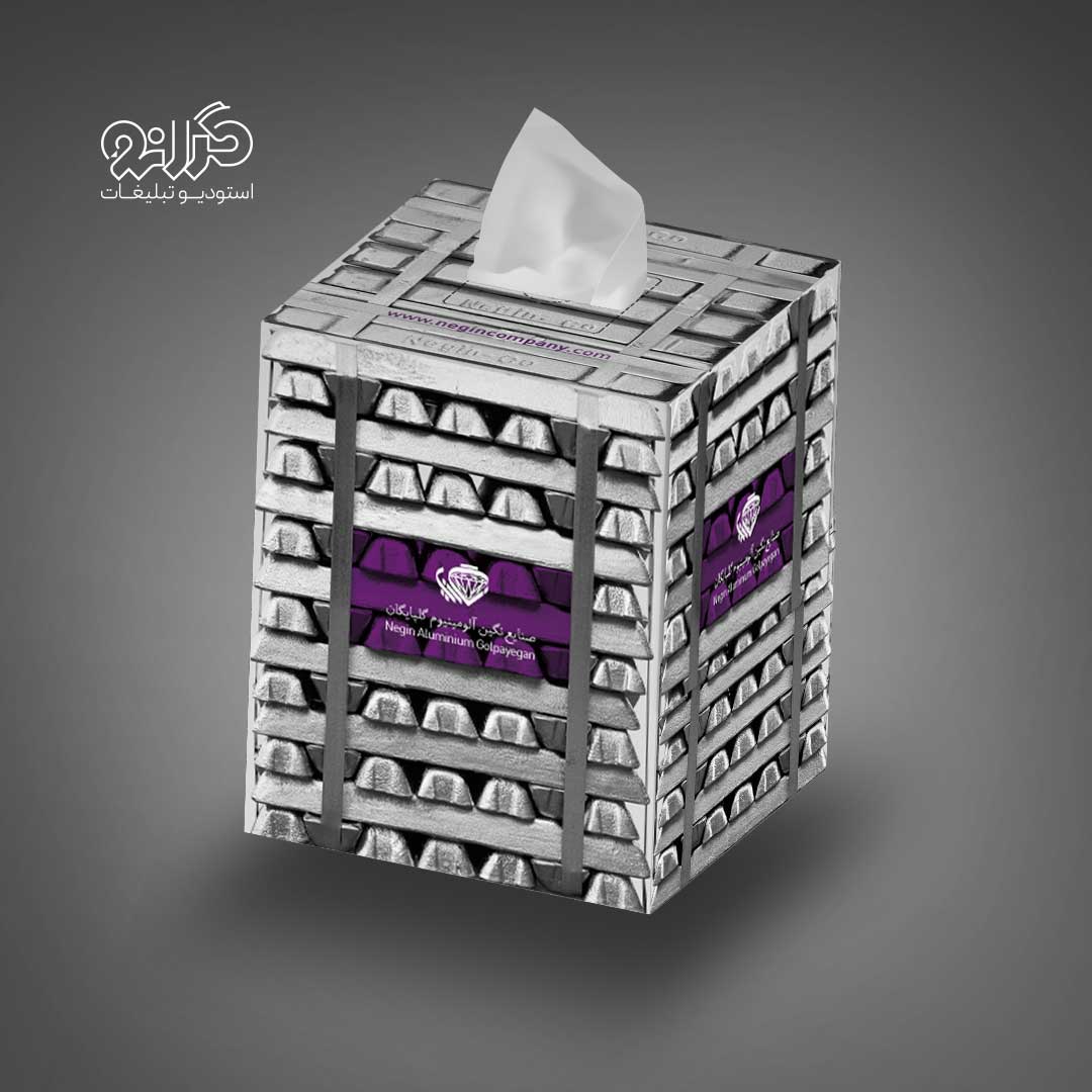 طراحی بسته‌بندی جعبه دستمال کاغذی هلدینگ نگین | نمونه‌کار بسته‌بندی